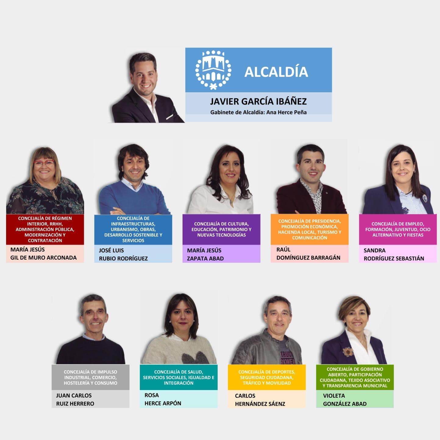 Con todo, la nueva composición del Equipo de Gobierno municipal, encabezada por el alcalde, queda formada por María Jesús Gil de Muro como primera teniente de alcalde y concejal de Régimen Interior, Recursos Humanos, Administración Pública, Modernización y Contratación, que se hace cargo de las delegaciones de recursos humanos, modernización de la Administración Pública, contratación pública y protección civil.